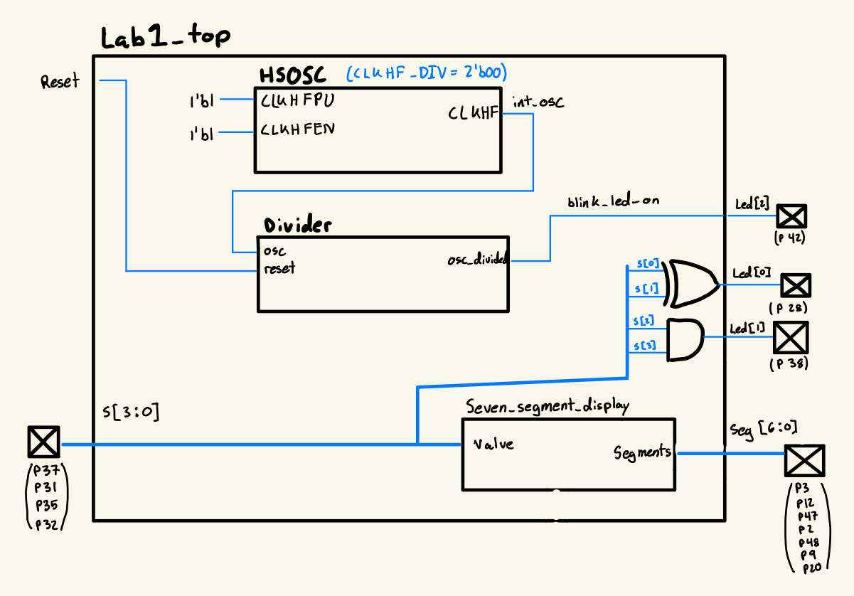 In this lab, simple SystemVerilog modules were designed to control a seven-segment display as well as blink an LED at 2.4Hz. The design utilized onboard switches to designate the hexidecimal number to display as well as the onboard 48MHz high-speed oscillator to generate the 2.4Hz signal.