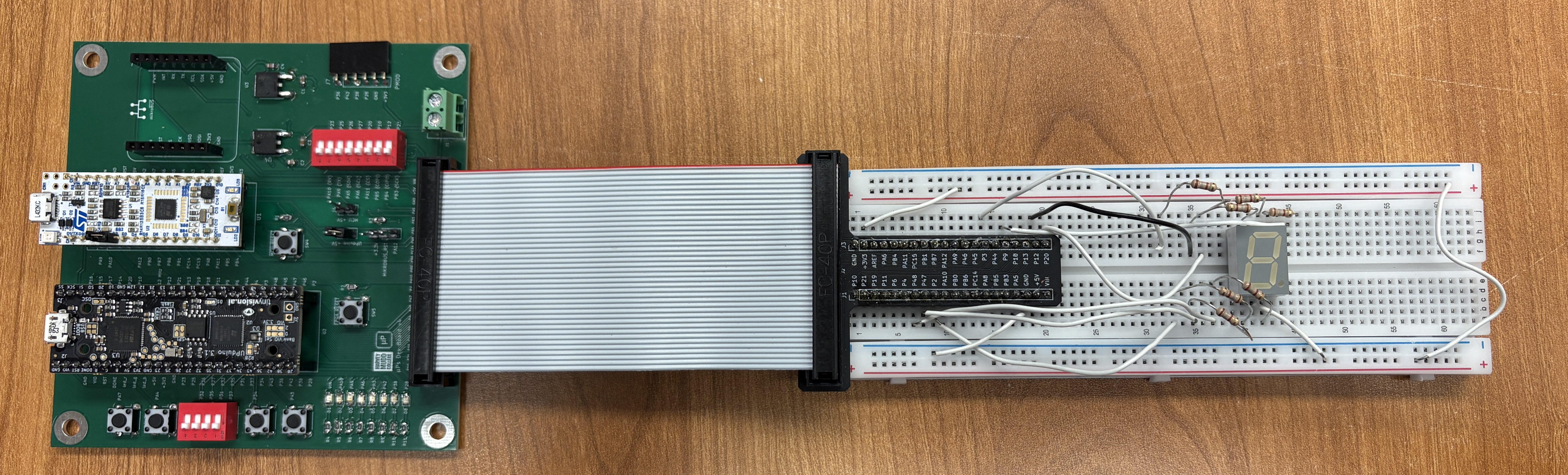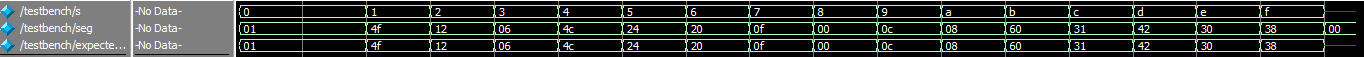 The seven segment display and onboard LEDs are controlled via combinational logic and their functionality is confirmed by testbenches that consider all 2^4 input permutations. The seven segment display is powered by a 3v3 line where each LED drains through a resistor to a pin on the FPGA.