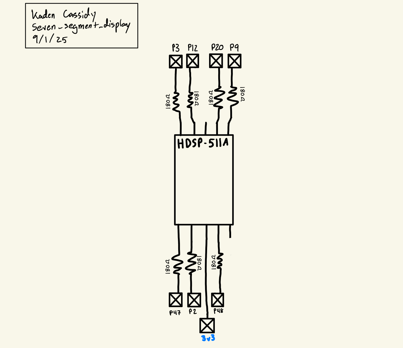 The schematic gives the design of the circuit breadboarded, the general idea being that the 3v3 line is connected to a common terminal on the seven segment display, then each LED drains through a 180 ohm resistor to an FPGA pin. If the pin is high, there is no voltage difference and no current flows, when the pin goes low the LED drains through the pin to ground. A resistance of 180 ohms was chosen as 7.5mA was identified as an optimal current from the datasheet, and the LED is expected to have a 1.95v drop at this current. Thus (3.3-1.95) / 7.5mA = 180 ohms.