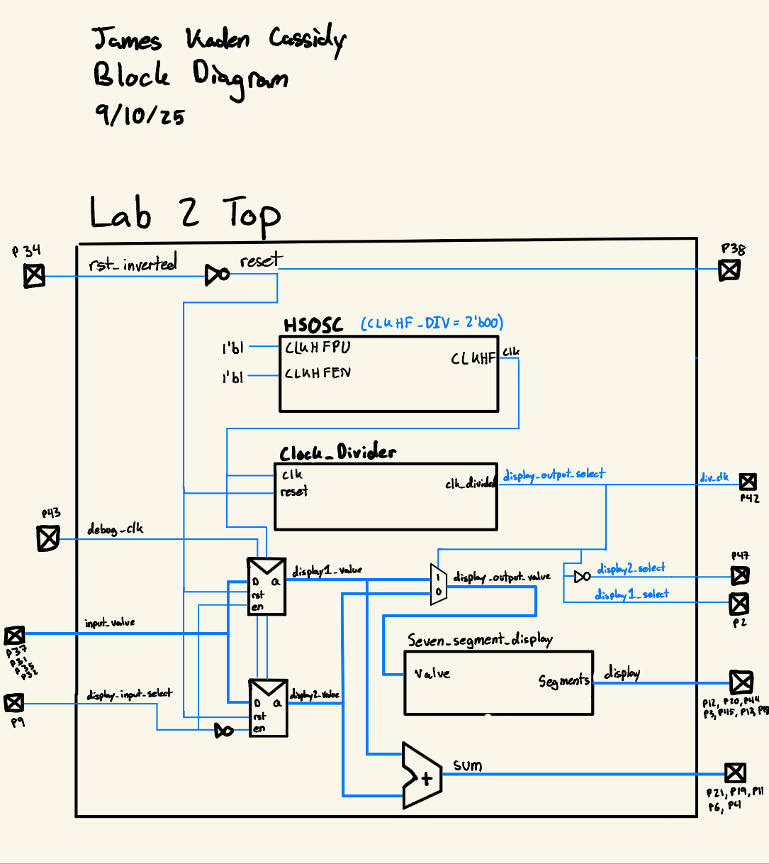 In this lab, the modules from the previous lab were used to control two seven-segment displays with a single display decoder, and a single set of seven pins, by time multiplexing between the two displays. In this lab, the FPGA is used distinctly as a control unit (rather than also as a source of power) to develop a deeper understanding of how to use an FPGA in real world applications.