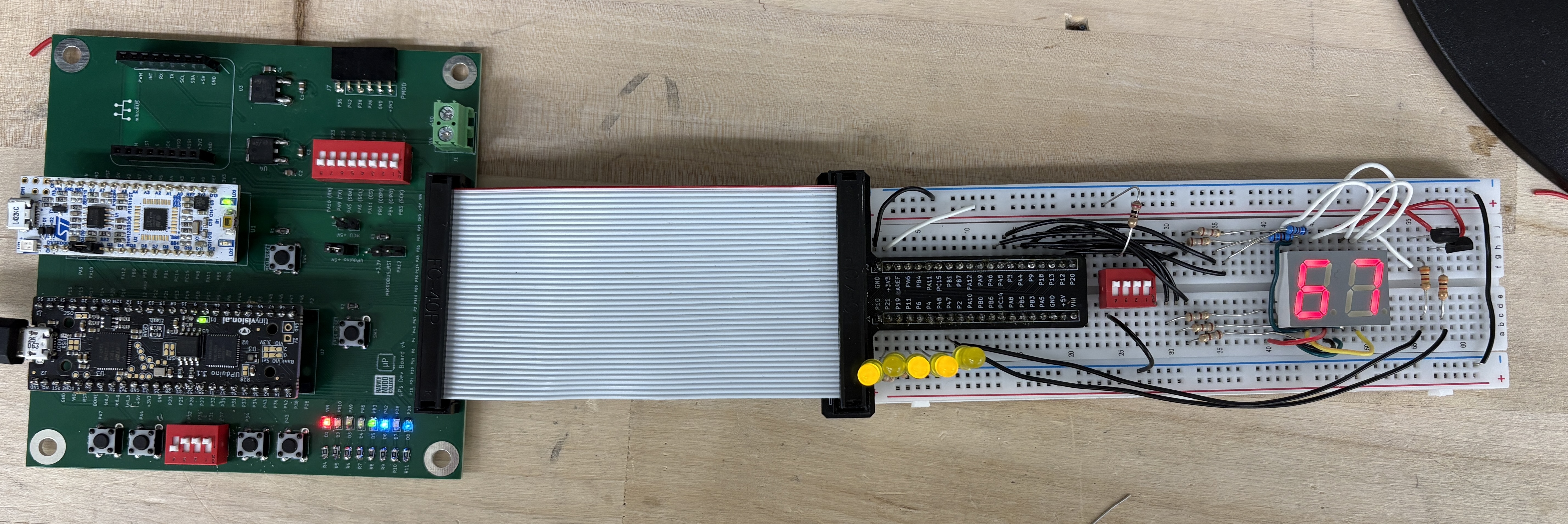 On the breadboard, the common terminals of the two seven-segment displays were bridged so that a single set of 7 pins could be used to drive both displays. A PNP transistor was used to selectively power one display at a time, by connecting an FPGA pin to the base of the transistor through a 3k resistor.