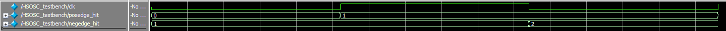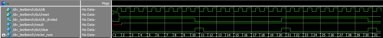 The testbenches were used to confirm that the parameterized divider works correctly, the adder correctly sums and displays all possible values and the onboard oscillator oscillates. Getting the testbench to run also proved useful for debugging before uploading to the FPGA.