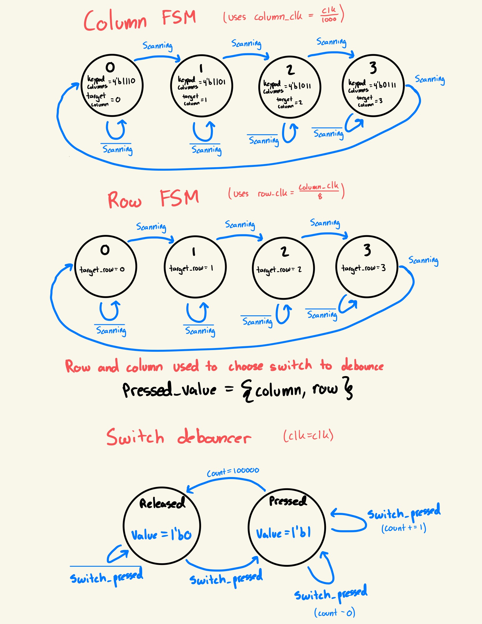 The on-board high-speed oscillator (HSOSC) from the iCE40 UltraPlus primitive library was used to generate a clock signal at 48 MHz. A clock divider is then used to reduce the clock in several key ways. The original clock is reduced by 200000 to create the signal used to display the two previous digits on 2 seven-segment displays with only 9 wires as achieved in the previous lab. The original clock is also reduced by 2000 to scan the rows of the keypad, and the row clock is then reduced by another 16 times to create the column clock which is then used to scan the columns. These clocks drive a series of flip flops with adders connected to themselves to iterate over the columns and rows of the keypad. These counts are used to mux the switches into a single switch debouncer, and when the switch has registered a press, all counters stop until the switch is released. A keypress is registered by first passing through a synchronizer to stablize the input, then through a switch debouncer. The switch debouncer functions by moving to a “Pressed” state upon a high input signal, but will only move to a “Released” state after registering no high input signal for 100000 clock cycles.