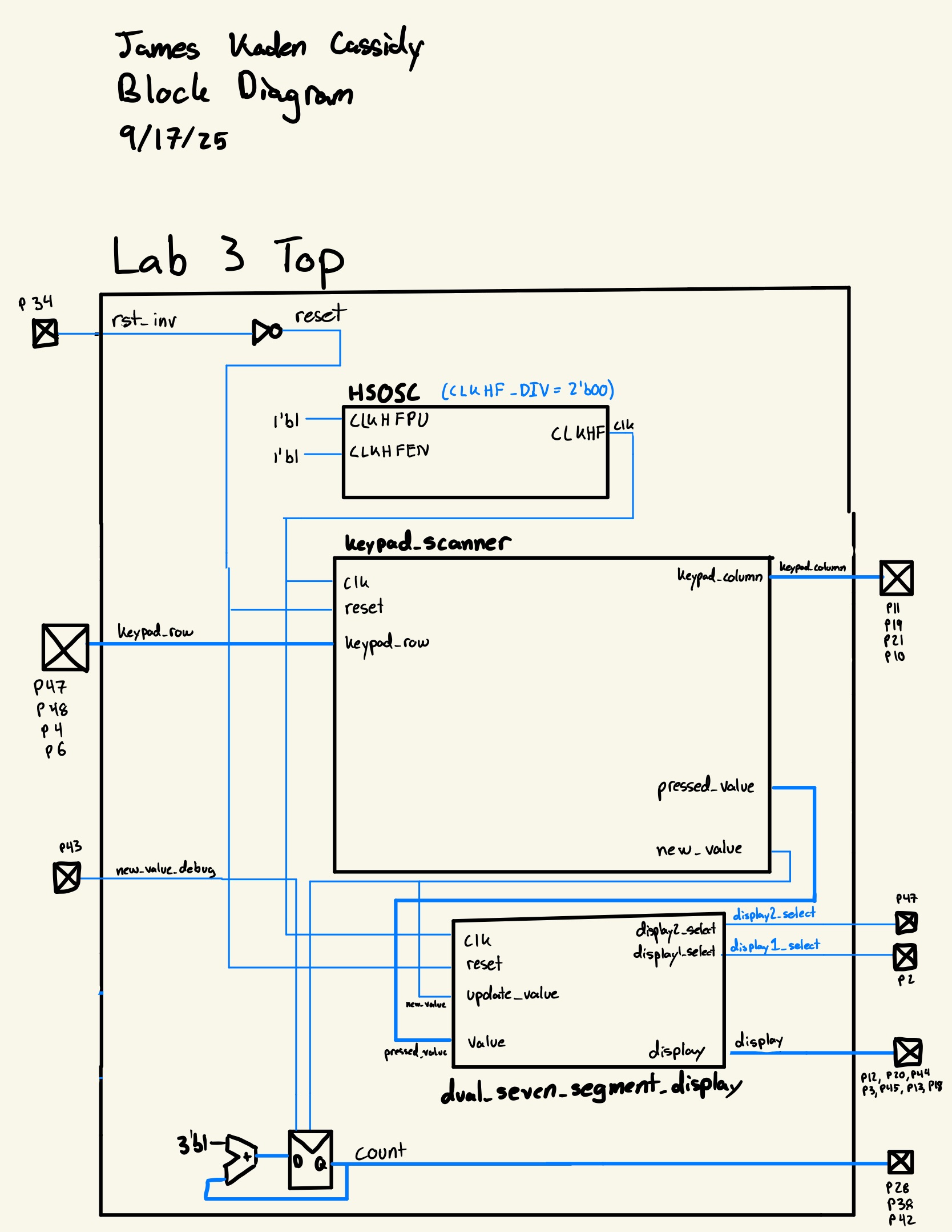 The block diagram gives a high-level schematic of the overall design. The top module include the high-speed oscillator, keypad scanner, and dual seven-segment display driver as well as an adder used to count new key presses.