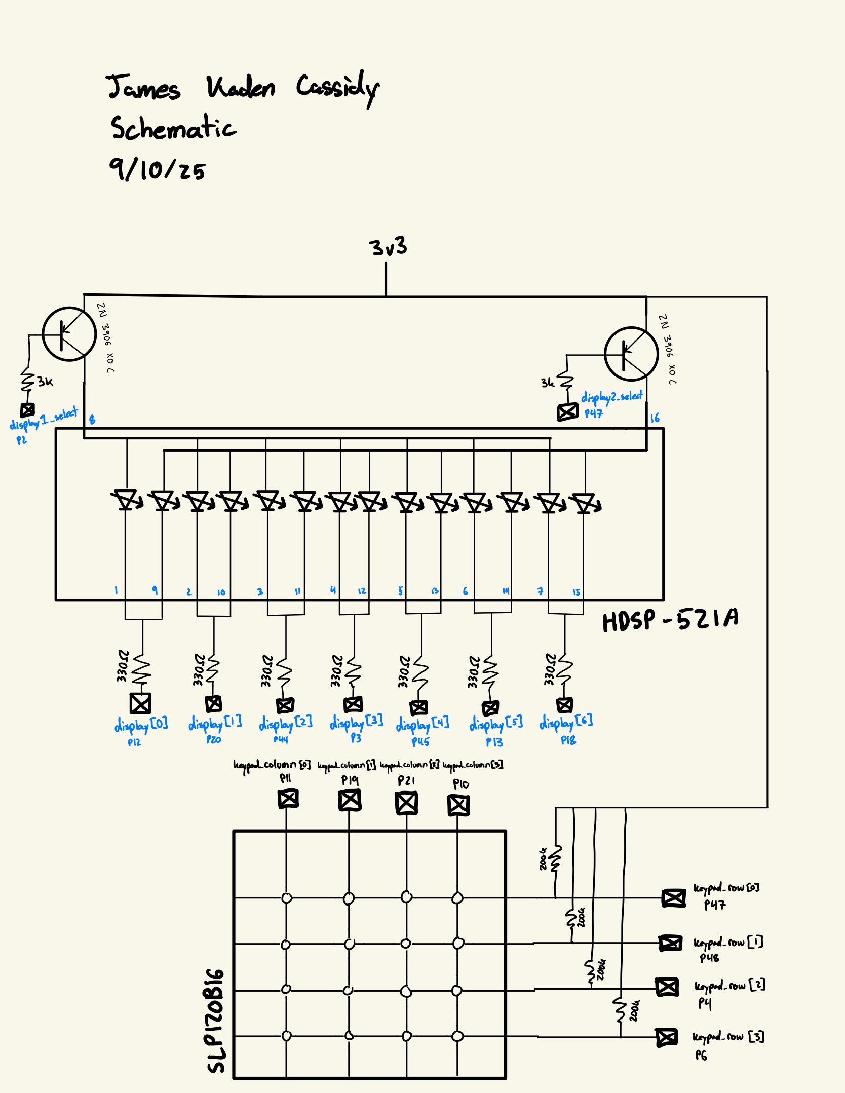 The schematic gives the design of the circuit breadboarded, the general idea is that the two common terminals of the seven-segment displays are connected and then connected through a 330 ohm resistor to an FPGA pin. The power terminal for each display is connected to the collector of a transistor where the base is connected to an FPGA pin through a 3k resistor. The emitter is then connected to the 3v3 line and this setup allows for 9 pins to control 2 seven-segment displays.