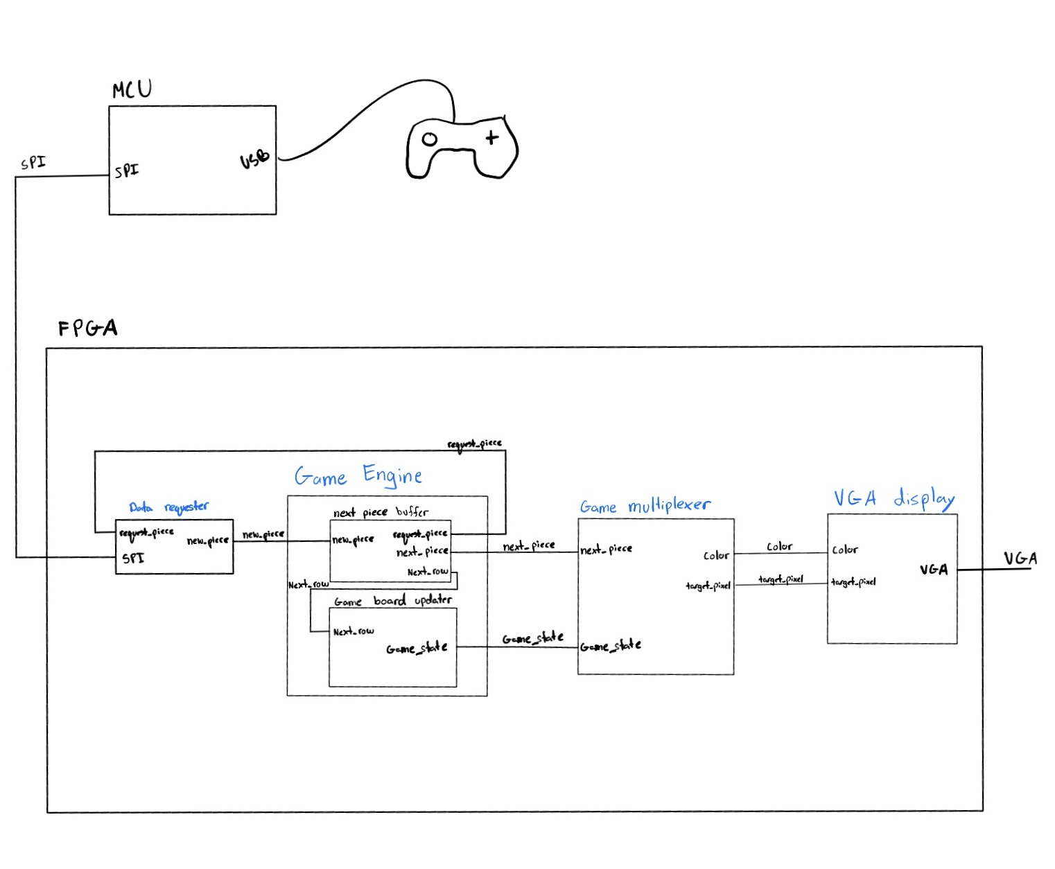 Our project implements the classic game Tetris directly in hardware using an FPGA as the game engine and a microcontroller (MCU) as a peripheral co-processor. The FPGA handles core game logic and VGA display output, while the MCU manages higher-level logic such as random block generation and controller input translation.